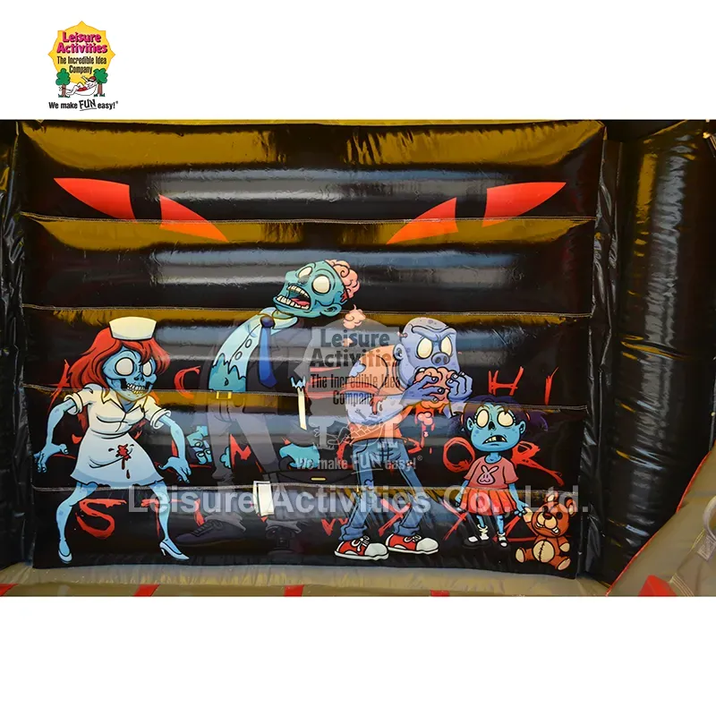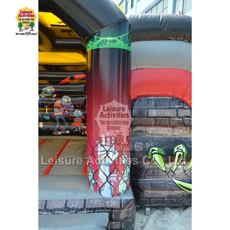 స్లయిడ్‌తో వెంటాడే చిన్న గాలితో కూడిన మల్టీప్లే ఎగిరి పడే కోటలు: ఈ జోంబీ థీమ్‌తో కూడిన "హాంటెడ్ కాంబో" గాలితో కూడిన థ్రిల్లింగ్ కార్టూన్-హారర్ సౌందర్యంతో పిల్లలను ఆకర్షించేలా రూపొందించబడింది. బోల్డ్ రెడ్స్, గ్లోసీ బ్లాక్స్ మరియు వింత ఆకుకూరలు మరియు బ్లూస్ యొక్క బోల్డ్ కలయిక స్పష్టమైన, ఉత్తేజకరమైన వాతావరణాన్ని సృష్టిస్తుంది. డైనమిక్ భంగిమల్లో కార్టూన్ జాంబీస్ యొక్క పెద్ద, ఉల్లాసభరితమైన గ్రాఫిక్స్-నర్స్, బ్రెయిన్ తినే పాత్ర మరియు టెడ్డీ బేర్‌తో ఉన్న జోంబీ కిడ్ వంటివి-భయపెట్టడం కంటే సరదాగా ఉంటాయి. పెద్ద నీలిరంగు జోంబీ పైకప్పుపై క్రాల్ చేయడం, గోళ్లతో గోడలు పగిలిపోవడం మరియు నిలువు వరుసలపై గొలుసులు/గ్రాఫిక్‌లు వంటి ఇంటరాక్టివ్ అంశాలు ఊహాత్మక ఆటను రేకెత్తిస్తాయి. రక్షిత టాప్ కవర్‌తో కూడిన మూసివున్న నిర్మాణం నీడ మరియు తేలికపాటి వర్షపు రక్షణను అందిస్తుంది, అయితే పరివేష్టిత స్లయిడ్ సాహసానికి జోడిస్తుంది. 10 అడుగుల ఎత్తు ఇండోర్ మరియు అవుట్‌డోర్ వినియోగానికి ఇది బహుముఖంగా ఉంటుంది, హాలోవీన్ పార్టీలు, పతనం పండుగలు, నేపథ్య పుట్టినరోజు ఈవెంట్‌లు మరియు భయానక పెరటి వినోదం కోసం ఖచ్చితంగా సరిపోతుంది.